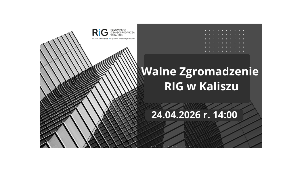 Zarząd Regionalnej Izby Gospodarczej w Kaliszu zwołuje na dzień 24.04.2026 r. (piątek) Zwyczajne Walne Zgromadzenie RIG w Kaliszu, które odbędzie się w restauracji Komoda Residence ul. Niecała 6a Kalisz o godz. 14.00.